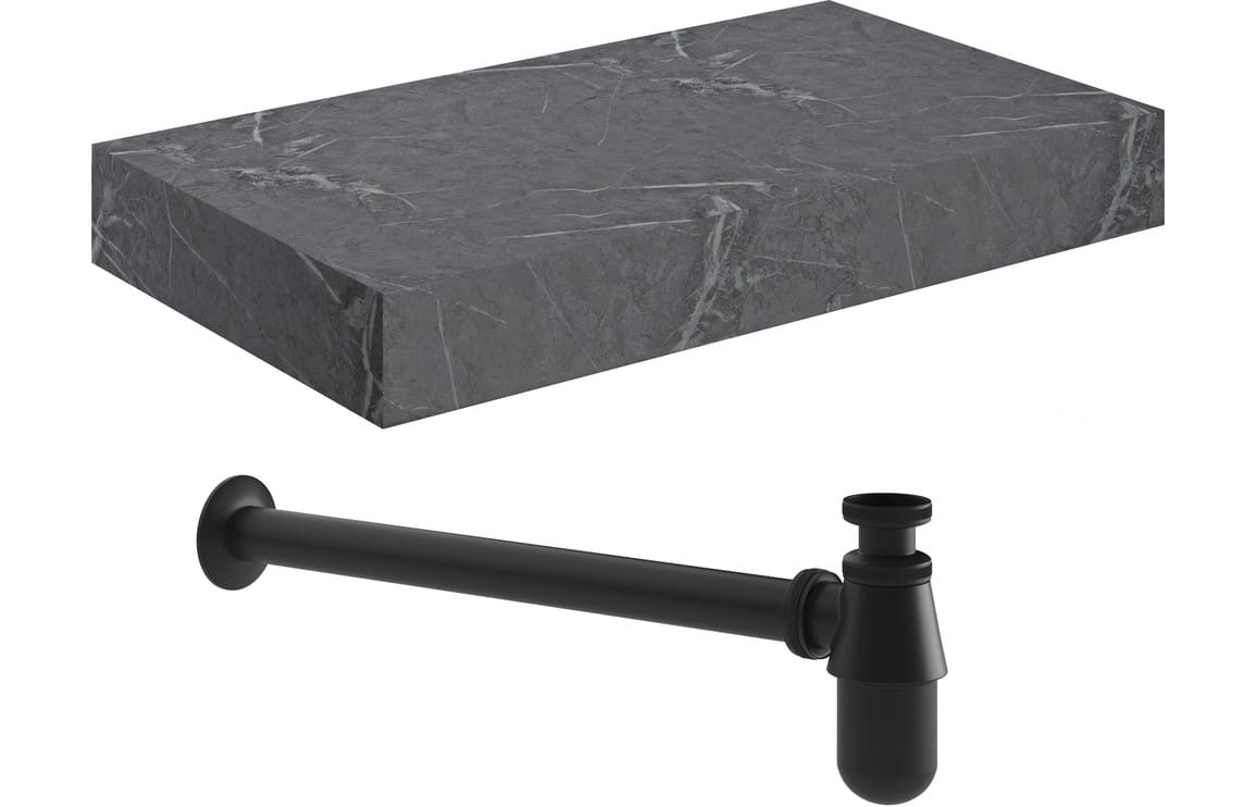 Ashima 800mm Wall Hung Grey Marble Basin Shelf & Black Bottle Trap