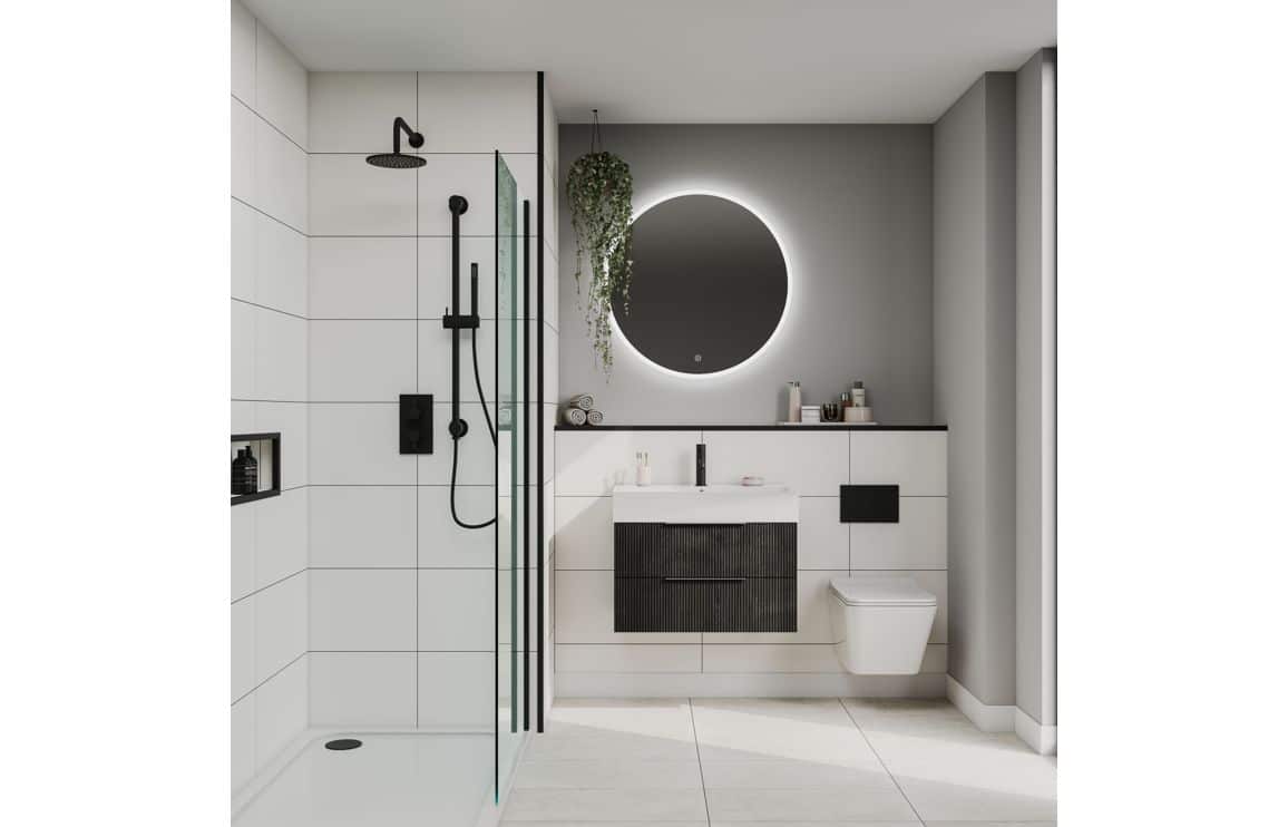 •White silk wall panels – classic clean and work well with everything! The perfect mix and match décor. The black grout line allows you to pair and style you black finishings to add a sophisticated feel to the bathroom.