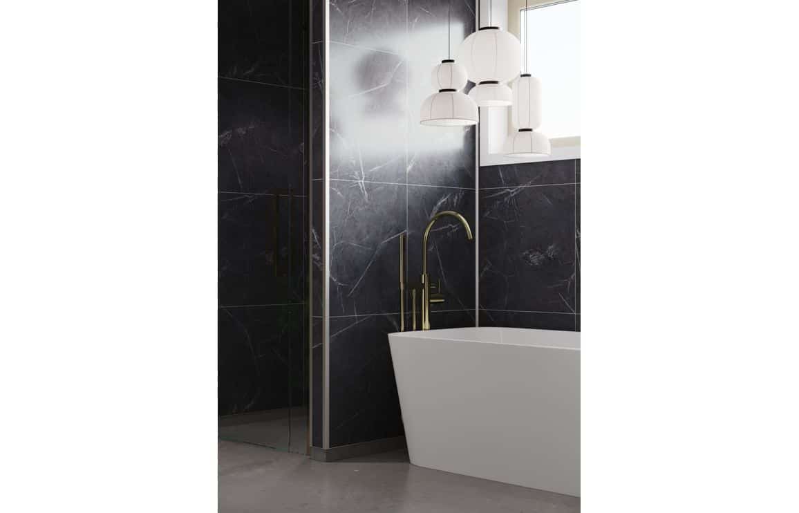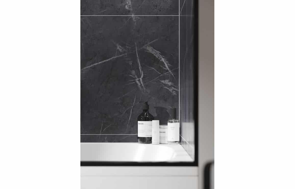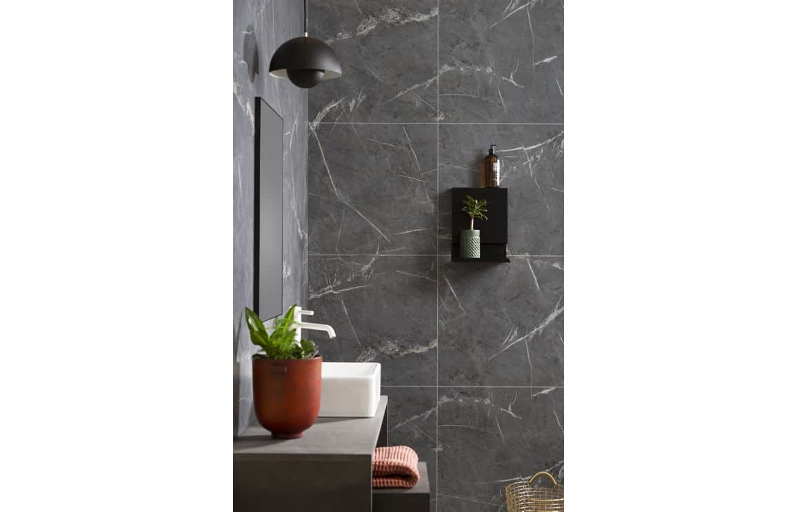 •This design is a modern marble effect. It's bold and classy and adds a touch of sophistication to any bathroom. The 60 x 60 cm tile effect makes this decor look great as a whole room covering or a feature wall.