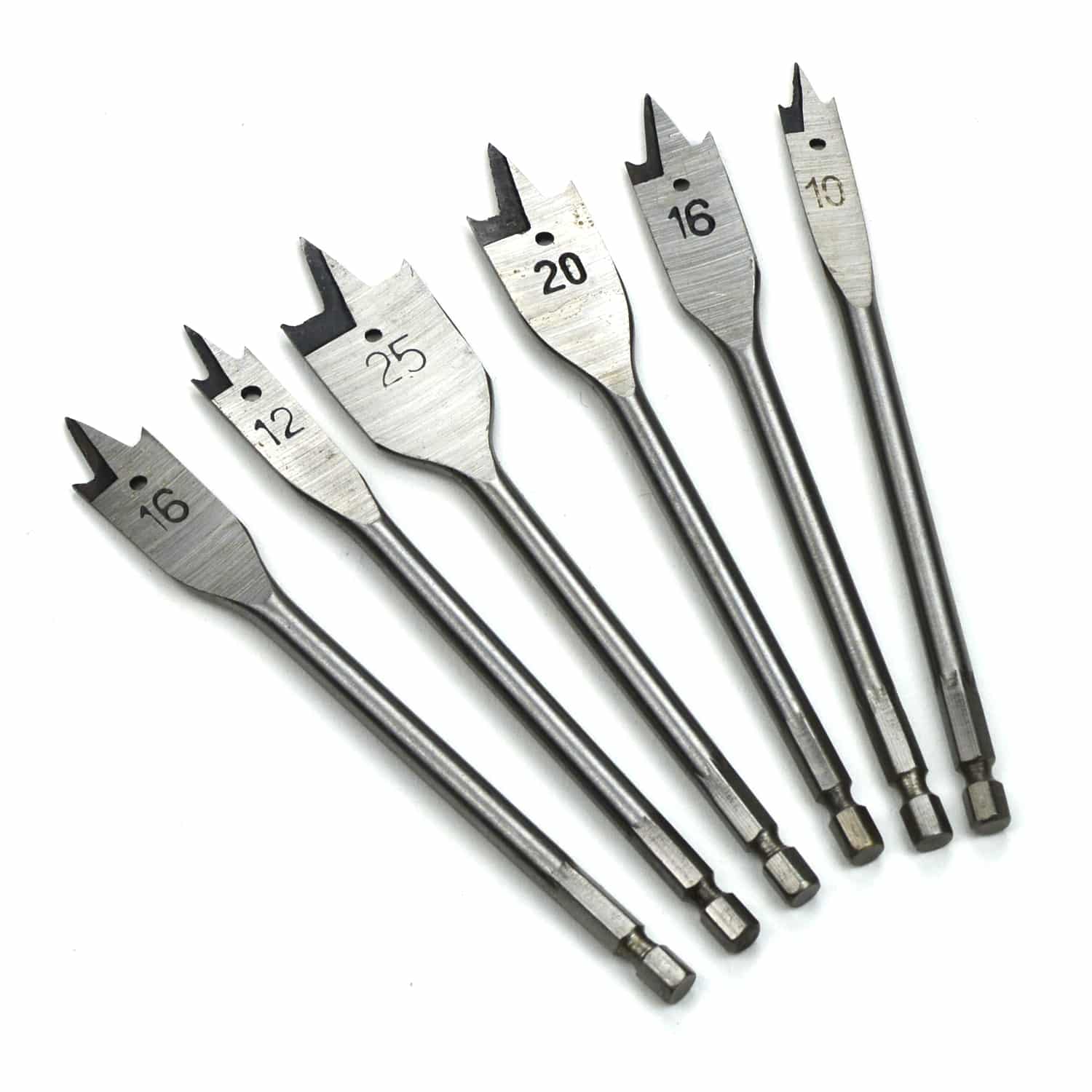 These Monument Flat Bits are suitable for drilling holes in timber joists etc. This set of 6 Flat Bits comprises the following sizes: 10mm, 12mm, 16mm, 18mm, 20mm, and 25mm. The bits are made from high-grade carbon steel for strength and wear resistance. Each bit has an overall length of 152 mm. They're ideal for fast drilling in materials including soft or hardwood, chipboard, or plasterboard. Applications that these bits are suited to include installing door locks and electrical equipment and routing pipes for plumbing.