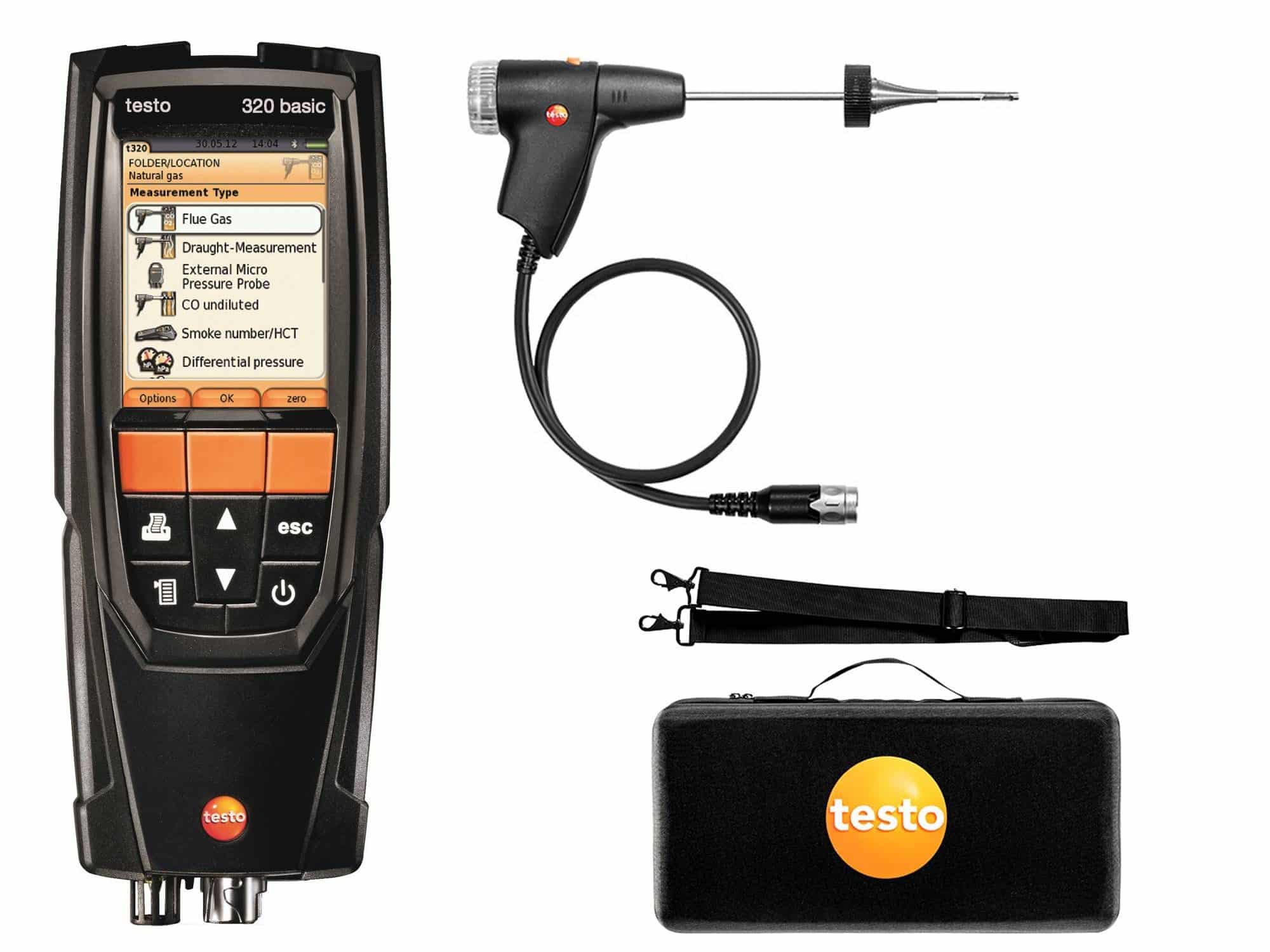 testo 320B Flue Gas Analyser, rechargeable battery and calibration protocol, Flue Gas Probe (180mm x 6mm diameter), Soft carry case with shoulder strap, AC/USB power supply.
